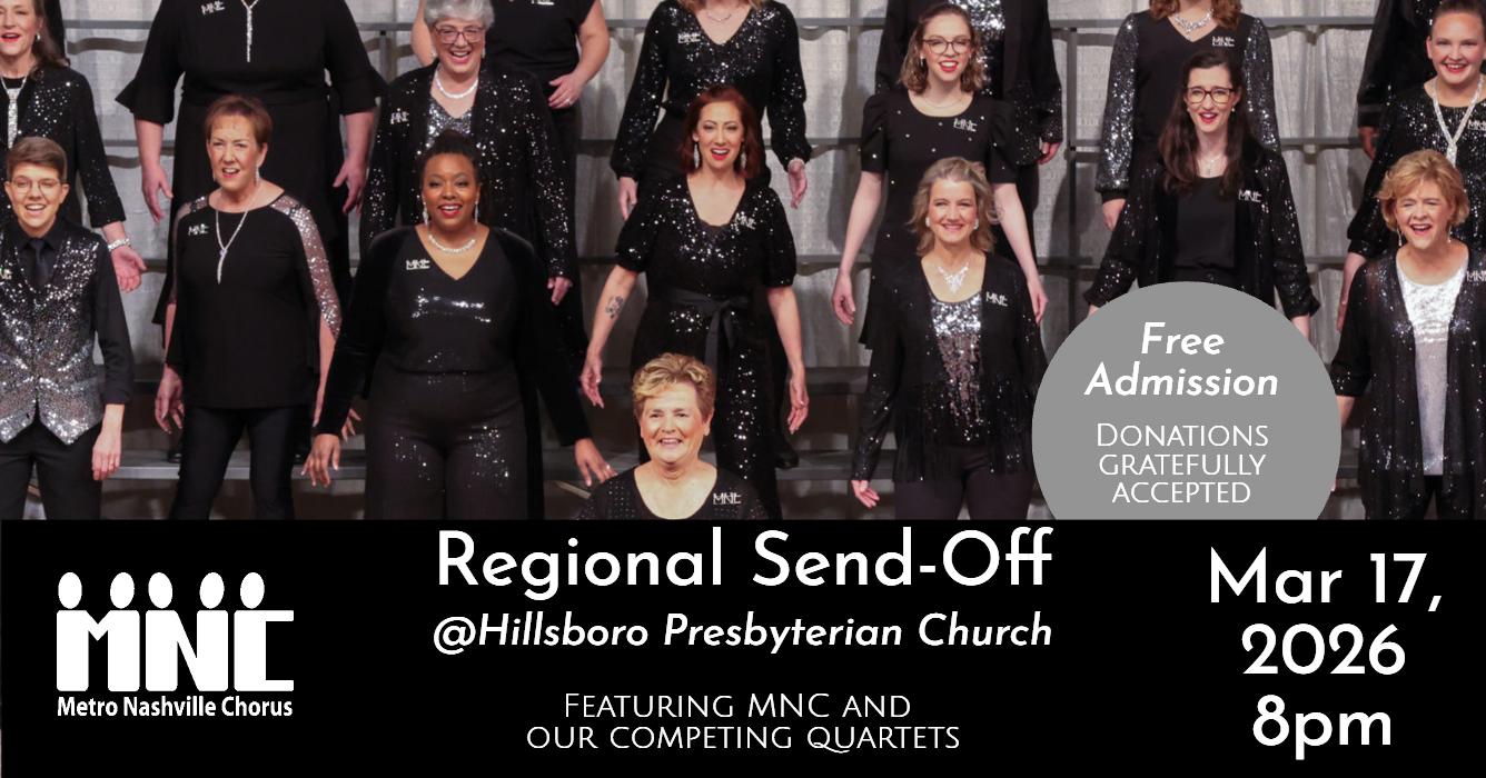 Help MNC prepare for our Regional Contest and enjoy an evening of Harmony! You'll enjoy songs from Metro Nashville Chorus and our competing quartets. The performance is free, but donations are gratefully accepted!